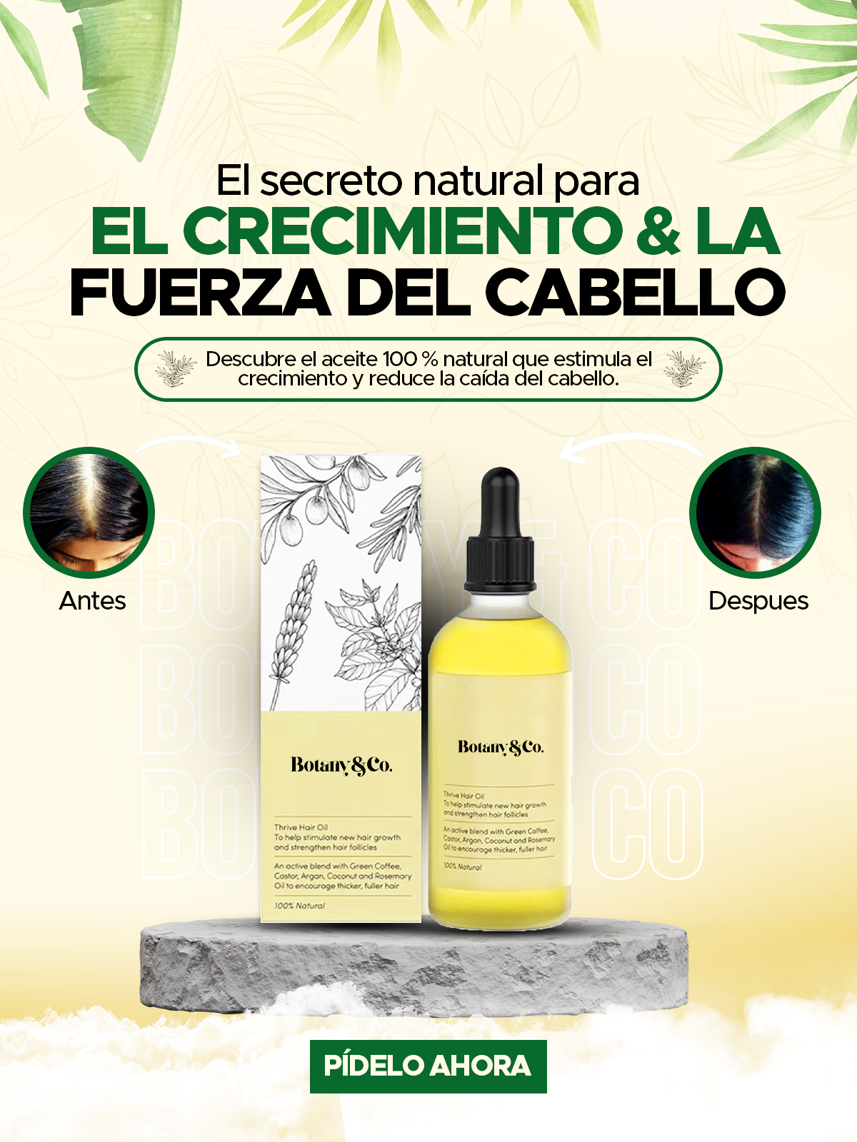 Promueve el crecimiento del cabello con biotina y cafeína.